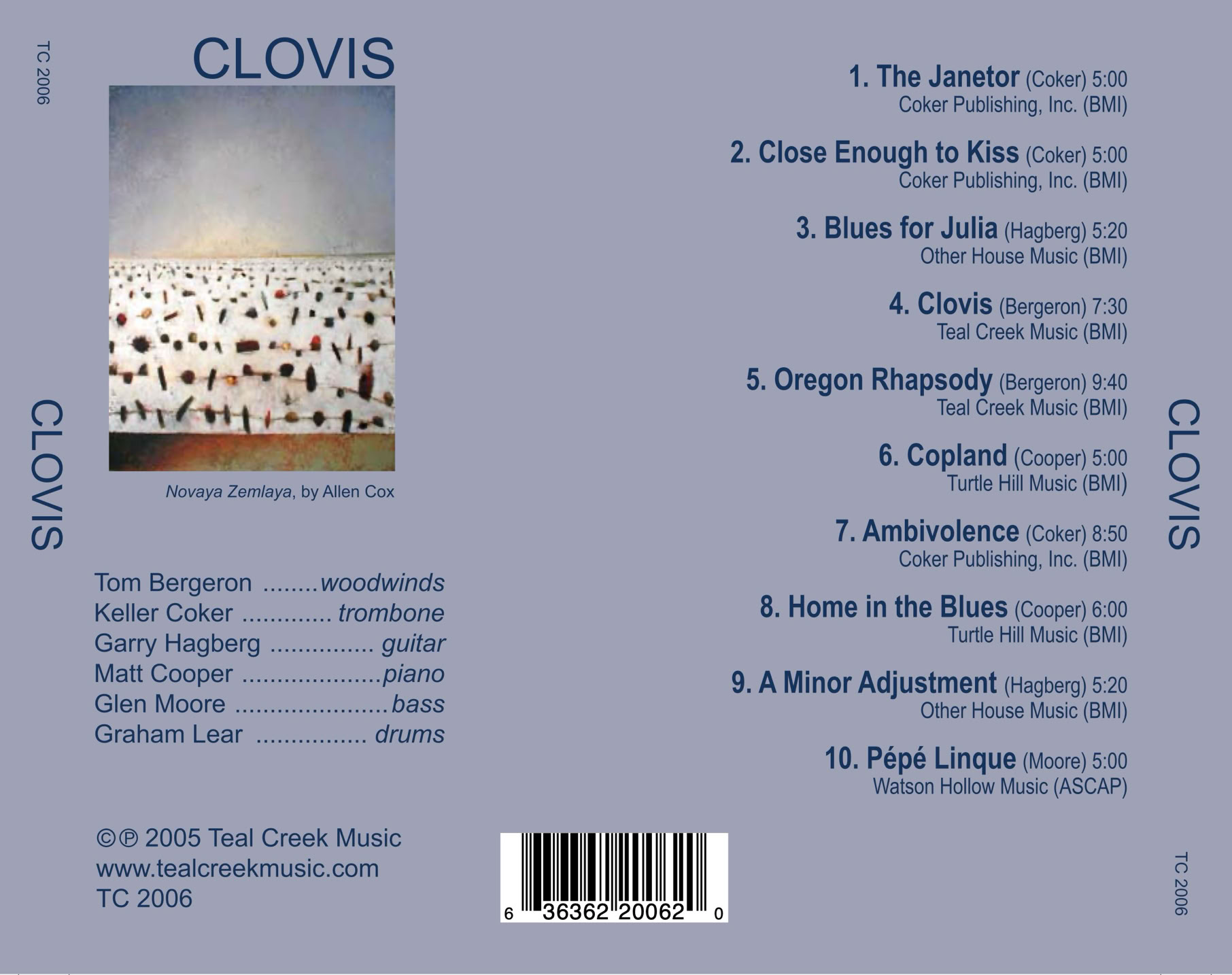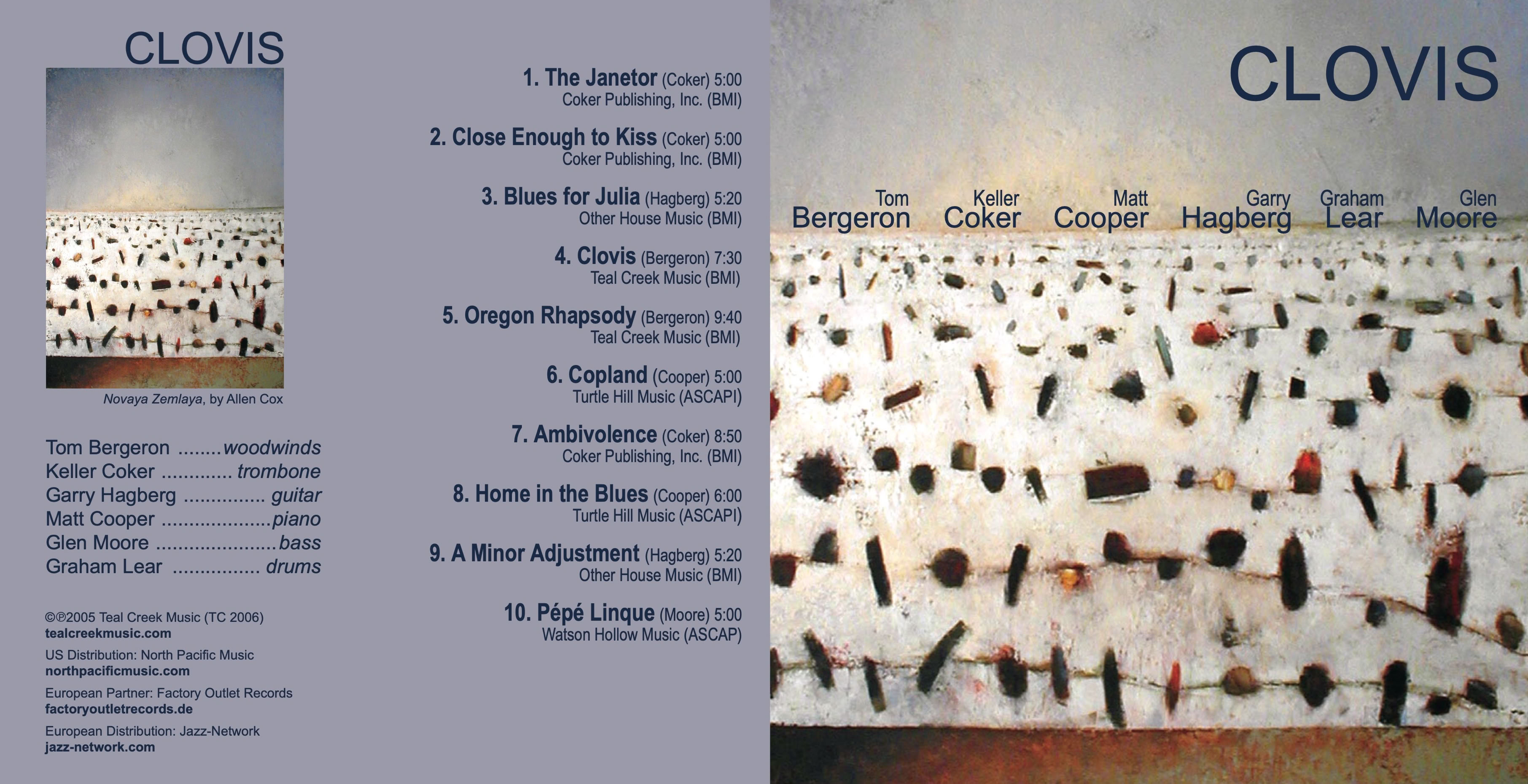 The album features compositions which range in style from Hagberg's sultry ballad, Blues for Julia, through Coker's Brazilian-tinged Close Enough to Kiss, the Northwest fusion of Cooper's Copland, and a tango by Bergeron, to Moore's classic toe-tapper, Pépé Linque. All of it is anchored and propelled by Lear's powerful and sensitive drumming.